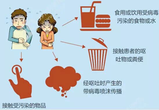 作为一种肠道病毒,诺如病毒通常通过这些途径感染:食用或饮用被诺如病毒污染的食物或水;触摸被诺如病毒污染的物体后未彻底洗净双手而进食;接触过诺如病毒感染患者,如照顾患者、与患者分享食物或共用餐具。