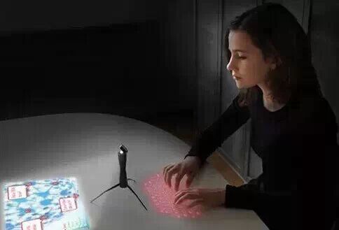 Spider Computer 由两个微型投影仪和三个不同角度的支架组成。它依靠顶部的内置投影仪将电脑中的内容显示出来,另一个投影用于显示激光键盘。投影即显示,投影即键盘。