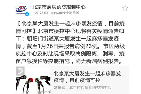 2015年1月22日,市疾控中心接到东城区疾控中心报告,该区某大厦发生一起麻疹暴发疫情。截至2015年1月26日共报告麻疹病例23例。市区两级疾控中心接到报告后及时赴现场采取了病例隔离、消毒、麻疹疫苗应急接种等控制措施。为防止麻疹疫情的传播,该大厦现已完成麻疹疫苗应急接种3462人。目前,该起疫情尚无新增病例报告。