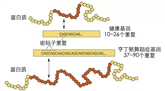 在与亨丁顿舞蹈症(Huntington’s disease)有关的基因编码中,CAG重复了很多次。如果在复制过程中多溜进去一套CAG碱基对,校对机制便有可能检查不出来,因为两边都有很多重复的CAG。多一个CAG的结果是产生的蛋白质多了一个氨基酸。幸运的是这个蛋白质有一定灵活性,可以容纳些许多余。只有当变异的长度超过一个关键值时才会发病。而由于错误会逐代积累,亨丁顿舞蹈症在子代身上会比父代更加严重。