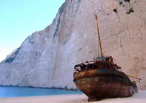 沉船湾(Navagio Beach)位于希腊西部的扎金索斯岛。这里有蔚蓝的海水,还有一艘老朽的沉船,静静躺在洁白的沙滩上。