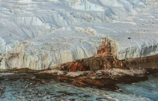 南极洲泰勒冰川的血瀑布等富含铁的海水也可能造成红雪。照片显示,水从泰勒冰川下一个古老水库内渗出来。铁接触到大气,被氧化,变成红色。