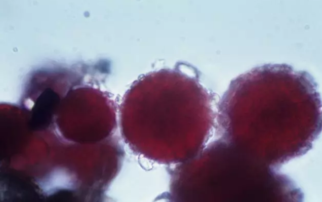 但雪呈现红色,却是由一个完全不同的原因造成的。嗜冷的淡水海藻——雪衣藻(照片显示)含有一种鲜红的色素,这是雪显示红色的奥秘。这样的雪叫“西瓜雪”,最常出现在高寒地区和极地海岸沿线地区的夏季。