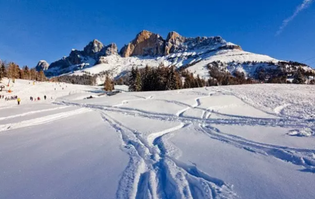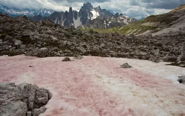 照片展示了意大利多洛米蒂山的红雪。有趣的是,雪衣藻细胞在显微镜下呈现绿色。它们在雪中显示粉红色是由一种叫β-胡萝卜素的生物化学物质造成的。这种成分保护雪衣藻的叶绿素免遭太阳光线的伤害。但在这个过程中,它使雪衣藻呈现红色或粉红色,而不是绿色。