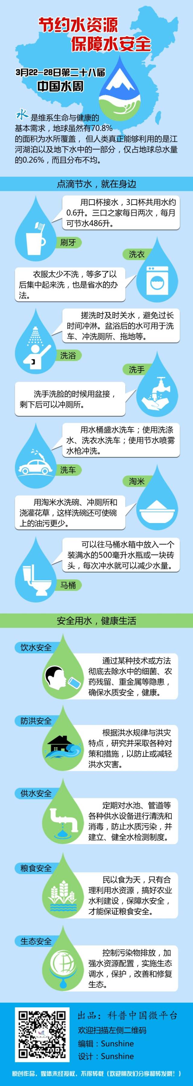 全球有近九亿人无法获得安全的饮用水,水质恶化已经严重影响生态环境和人类健康。为了唤醒大家的节水意识,因此每年的3月22日-28日被称为中国水周,让我们珍惜水资源,点滴水源,从你我做起吧!