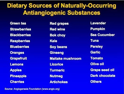 威廉·李的研究团队发现很多食物、饮料和药草含有能够预防血管新生的物质,如红酒中的白藜芦醇能抑制60%的异常血管新生,草莓和大豆的萃取物也有一定作用。有些食物(如葡萄、莓类、大蒜等)的作用甚至比抗癌药物更好。而且他们发现食物间具有协同作用,也就是说,同时吃几种不同有益食物的效果比单吃一种好。哈佛大学进行的一项历经20年,涉及7万9千人的研究也发现,每周食用两次到三次烹饪过的番茄的男人得前列腺癌的几率比其他人降低一半。而番茄中的茄红素,已经被证明能够显著降低血管新生。