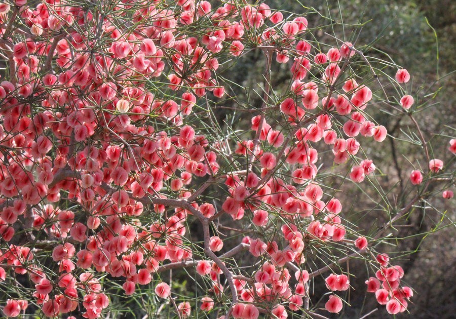其实,它的果实形状是多种多样的,根据果实的形态就分成了几派:一类是翅果派,它的果实外缘长了四片棱状的“翅膀”,乔木状沙拐枣、头状沙拐枣、五叶沙拐枣、红秆沙拐枣等都属这一派;一类是刺果派,在果实外长满了刺毛,费尔干纳沙拐枣、红果沙拐枣等属于这一派;一类是囊果派,果实包在薄薄的膜中,像挂满了串串小灯笼,如灯笼状沙拐枣。翅果、囊果,都是种子在微风下就能吹到远处,而刺果则能吸附到人、畜身上带至远方。这些形态的果实,都是为了生命的传播,可见它们的煞费苦心了。