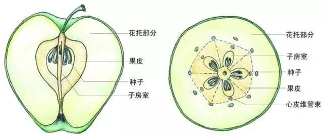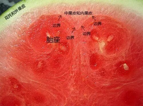 首先,我们来说说这两种水果的构造吧。从果实的分类上来说,苹果属于“梨果”这个大类,我们吃到的果肉主要是由花托、花萼和花筒发育而来,靠近种子,吃起来酸酸的那块则是由子房发育而来。西瓜则属于瓠果,并且是瓠果中较为特殊的一种,我们吃的瓜瓤是西瓜膨大的胎座发育而来的,简单的说,胎座就是西瓜产生种子的地方,可以形象地比喻成“植物胎盘”。