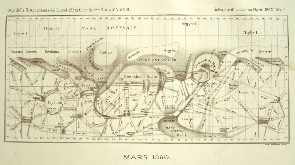 1887年意大利米兰天文台台长、天文学家斯基帕雷利首先用望远镜观察到火星上的沟渠系统(后误译为火星“运河”)以来,对火星存在生命、甚至“火星人”的猜测席卷全球。火星纵横交错的“运河”系统,表明火星上建立了发达的农业体系,相继各种“火星人”的科幻作品风靡一时。