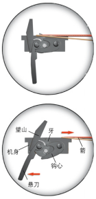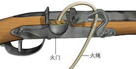 火绳枪上经过特殊处理的火绳能长期燃而不灭,通过转动扳机让绳头引燃火门中的发射药击发弹药