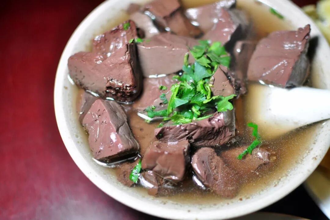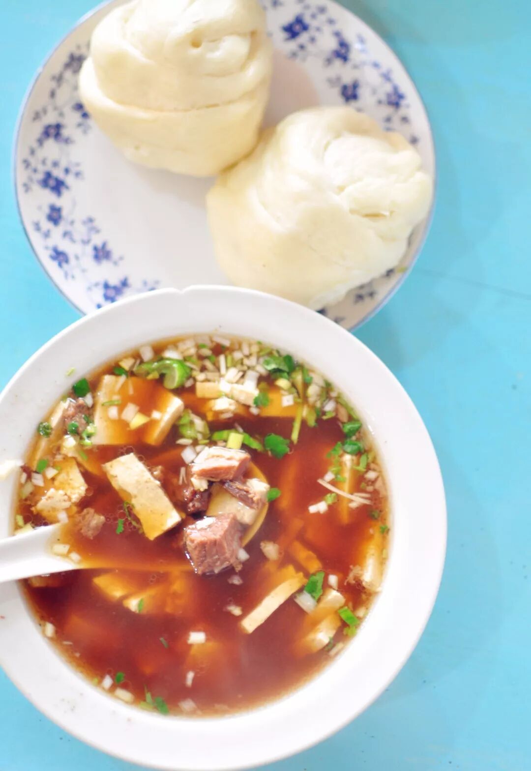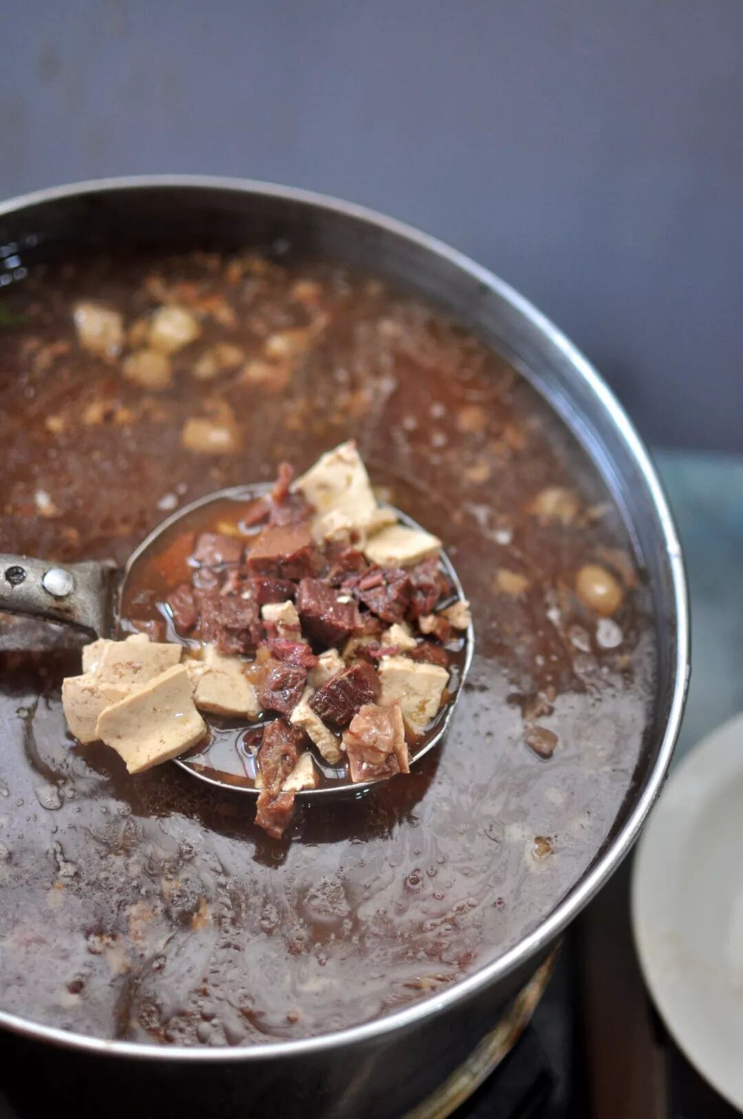 吃煎饼卷猪头肉一定要喝猪血汤,必须是当日现杀活猪放血所做血旺,必须要猪油炝锅,那样才香,再加入血旺和汤水,必须要加多多的胡椒,胡椒独有的香辣冲淡了血旺的微微腥臊,糯而香,浓郁扑鼻,咬一口猪头肉卷煎饼,喝一口猪血汤,这是博山早上最奢侈的早餐。