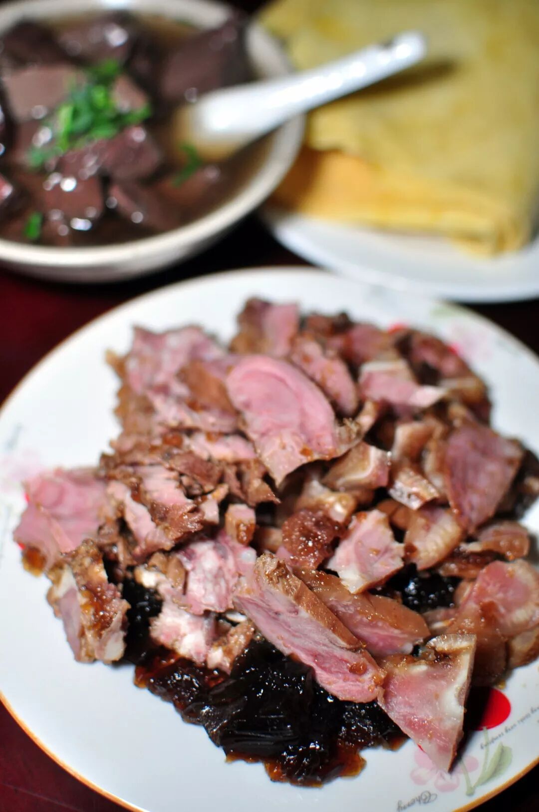 选自己喜欢吃的部位,或耳朵或口条或猪脸,口条拱嘴处吃的是肉嫩细腻,脸腮处吃的是皮滑肉嫩,最妙的是猪耳,切的薄薄的,带着些许的脆筋骨,咬起来在口中略有嘎吱脆头,最好吃。称上三两猪头肉,叫店家在案板上切得飞薄,盘子底下舀上颤悠悠酱红色的肉冻,猪头肉码放其上,和热乎乎的现摊的小米煎饼一起端上桌来,正宗的吃法是把热煎饼摊开,把猪头肉散落地夹在煎饼中,一定要再加一些肉冻,卷成桶装,大口咬下,煎饼的米香和猪头肉的肉香交织在一起,热热的煎饼和冰冰的肉冻在口腔形成了独特的感觉。妙不可言呢。