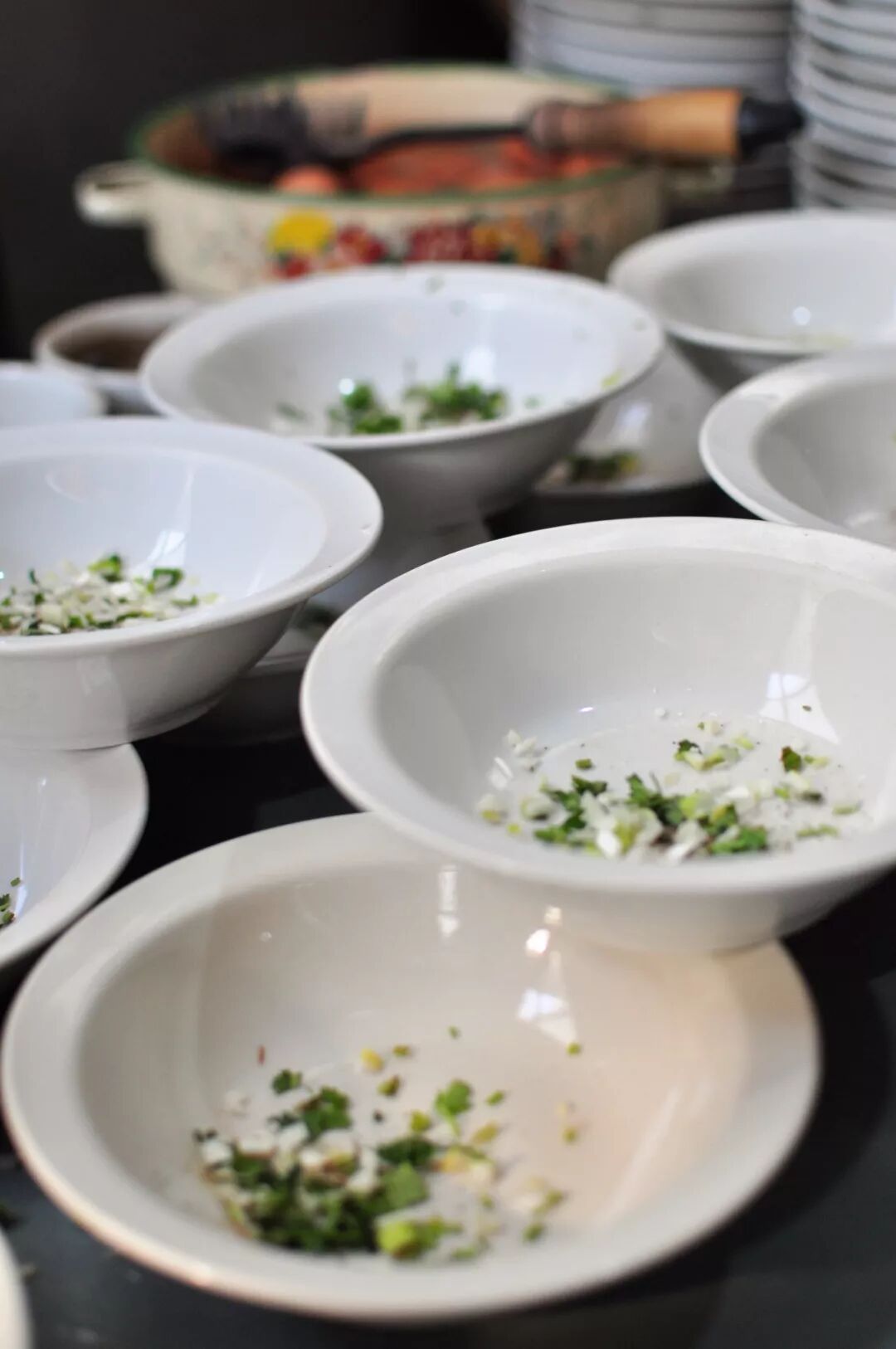 博山烩牛肉说是烩牛肉,其实是牛肉烩豆腐,把牛肉牛骨熬浓浓的汤,类似酱卤的做法。牛肉熟了,切碎碎的手指肚大小的粒,博山特有的酸浆卤水豆腐也切小小的丁,先在沸水中烫去豆腥,然后再和牛肉粒一起在牛肉汤中慢火煨炖得软烂鲜香,待客人来了,白瓷碗里撒一把切得碎碎的葱花,撒些许黑胡椒粉,然后从大锅中浓稠的舀起一勺扣入碗中,一碗烩牛肉就得了。