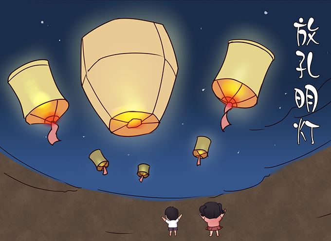 中秋节日之夜,在广场上引火点燃油枝,使孔明灯徐徐上升,光芒四射,与空中明月交相辉映。据相关资料记载,“孔明灯”又叫天灯,相传是由三国时的诸葛孔明(即诸葛亮)所发明。天灯又被称为“祈福灯”或“平安灯”。