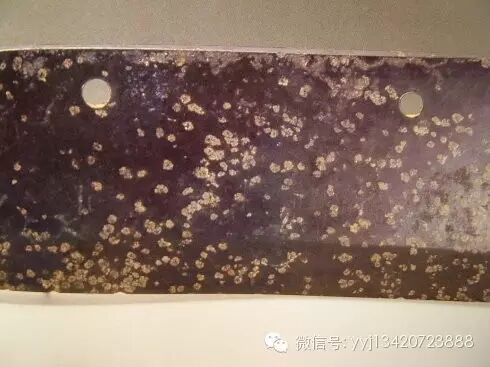 沁色看似神秘,实际上却是不难鉴识的,而且在实践中,也并不像陈性、刘大同讲的那样有那么多的种类。但是在具体鉴定时一定要心细如发,配合一定的工具,如强光灯、放大镜等,谨慎观察,并结合古玉器的玉质、器形、纹饰、雕工等综合鉴定。刘大同先生说:“玉器受地气,其各色之沁,皆由外而纳于内。”真的沁色都浸入玉的内部,与玉浑然一体。而假沁则多是浮在玉的表面,而且玉表也没有各种深浅不一的凹陷变化。如在石灰沁古玉上,往往有一圈参差错落的钙化的“包浆”,并可见未受沁处的玉质。在黑漆古古玉上,往往有根须般并有凹陷的沁痕,黑色中还会透出赭红色,迎光观察可见闪闪发光的晶点,俗称“苍蝇翅”。在钉金沁古玉上,器表会出现坑坑凹凹,好像被钉子钉过一样。在牛毛纹古玉上,可见“牛毛”是顺着一个方向呈一丝一丝状,而且有部分会有凹陷。在水沁古玉上,特点是沁色部分呈白色,而且异常干结。而蚀斑、蛀孔则是玉被浸蚀成斑斑点点和出现了孔洞。