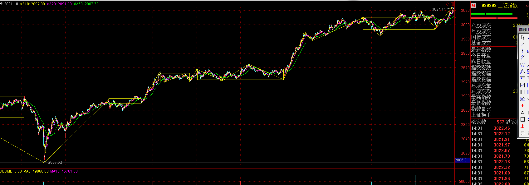 也就是说并不能确认一分钟级别上涨已经结束了,只是一分钟级别中枢震荡的走势,震荡结束后,如果继续向上突破新高,那么一分钟级别的上涨还将继续延续,(下午大盘如期向突破,充分说明了理论判断的有效性),但再度新高后,从大级别的形态上看,突破5分钟级别中枢后的走势已经形成一分钟级别的趋势上涨形态,所以后面如果不能出现继续强势大涨的走势,就要防止一分钟级别趋势上涨背驰的风险。一分钟级别上涨结束后,必然会有一分钟级别的回调走势出现。所以一旦确定背驰,就要减仓操作了,等一分钟级别回调结束后再进行回补。