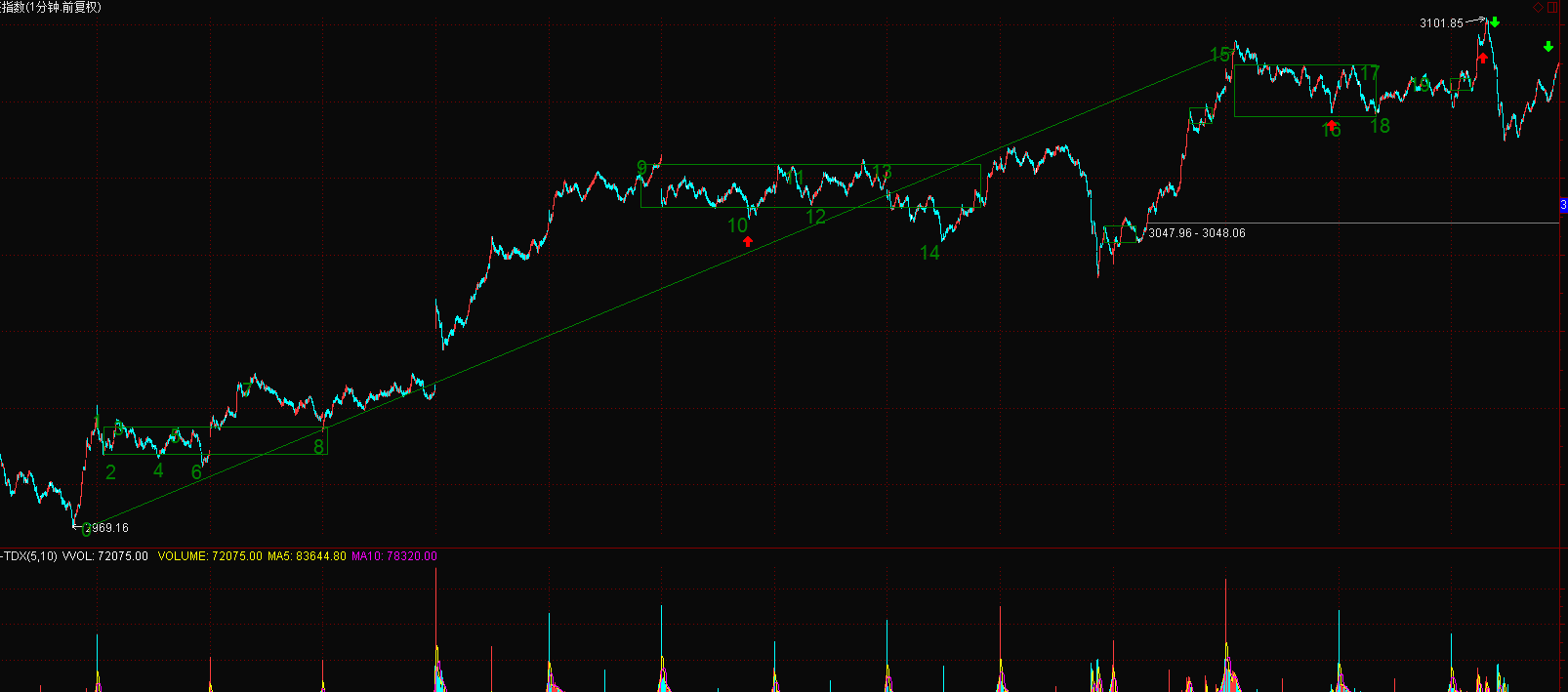 二.不能够突破早盘创出的3101.85点,这样就可以确认是这个一分钟上涨的第二卖点。