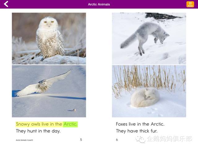 每个级别都有小说和非小说两个大类,这个产品除了有在线课程具备发音的优势之外,内容非常广泛,对于一部分科学类文章,企鹅妈妈曾经认为不到5岁的小企鹅可能不会感兴趣,却没有想到小企鹅看到津津有味,主要是这类科学题材结合幼儿熟悉和感兴趣的题材,生动有趣。如E系列中的Arctic Animals中,还记得小企鹅看到Snowy owls时,先“哇!它好漂亮啊!”,然后指着图片的问妈妈“它在hunt吗?”。这种吸引孩子眼球效果的还是来源于良好的阅读材料本身和优秀的内容编排所达到的。很难仅仅通过一个亲子阅读一本DK的百科全书达到。(至少企鹅妈妈是没有这个能力的)