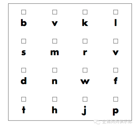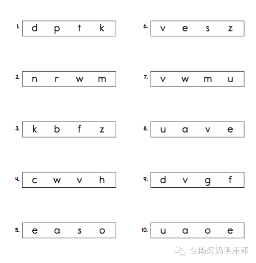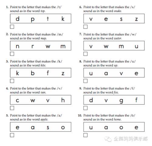 http://mmbiz.qpic.cn/mmbiz/52qNBpQW01MialmdUvxpgY9cqaXhEueiaQ9lpibspBKjJhIico0jtOdZas2myWNj6yb3YhkU9H5jx4cEB5gCfpibpZQ/640?wx_fmt=png&wxfrom=5&wx_lazy=1步骤2)测试孩子Sound和Symbols的识别(听)能力,这里有2个表格。第一个表格给测试老师使用的,上面有老师需要读出的10个单词,比如第一个的top,需要孩子听完老师的单词发音后在第二sheet上勾出对应单词的对应的第一个辅音字母,如top对应字母t。这个部分也需要需要全部正确。如果不能全部正确,测试需要终止。