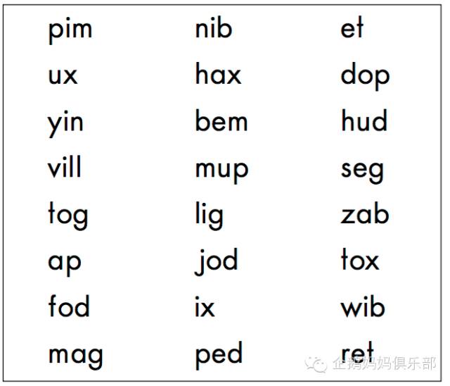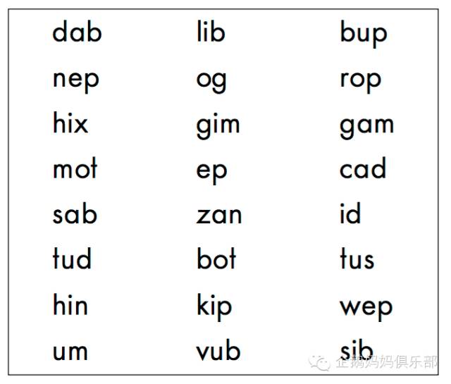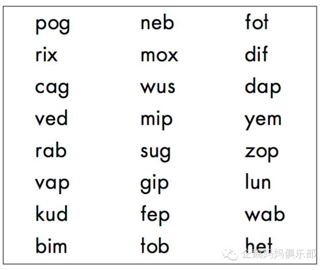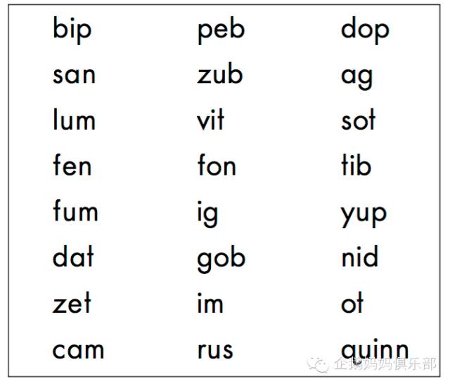 这个阶段考察孩子的在简单的CVC规则下的拼读能力,共计四个部分,每一个部分都需要在2分钟内完成将近24个word的拼读,可以用第一个word作为实例/p/,/i/,/m/->/pim/.