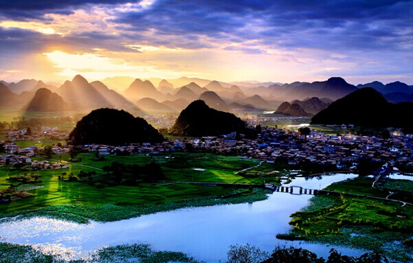 晨曦沐浴清河边,盛夏稻田绿又鲜,
