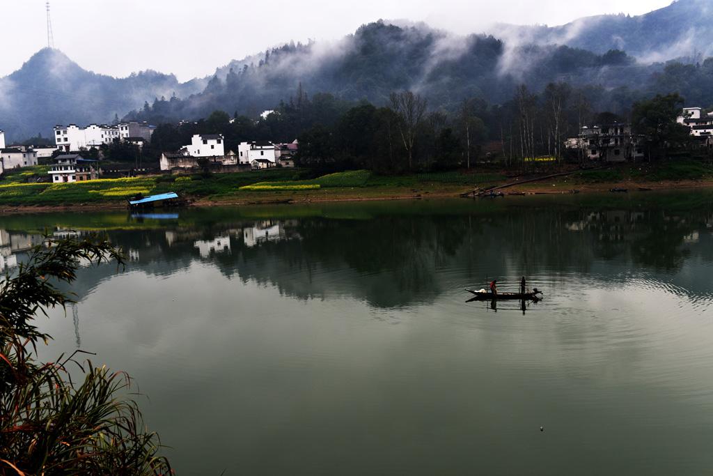闲坐村边小溪旁,远观轻雾绕山岗,