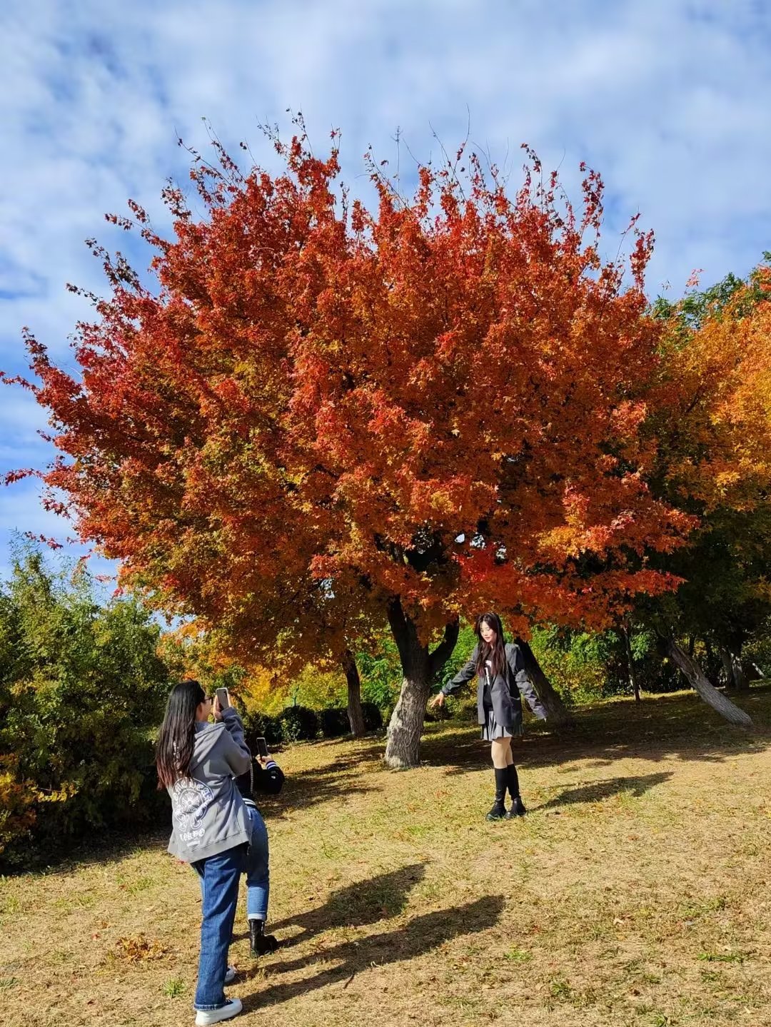 同伴半蹲持手机,抓住笑脸情绪衿。