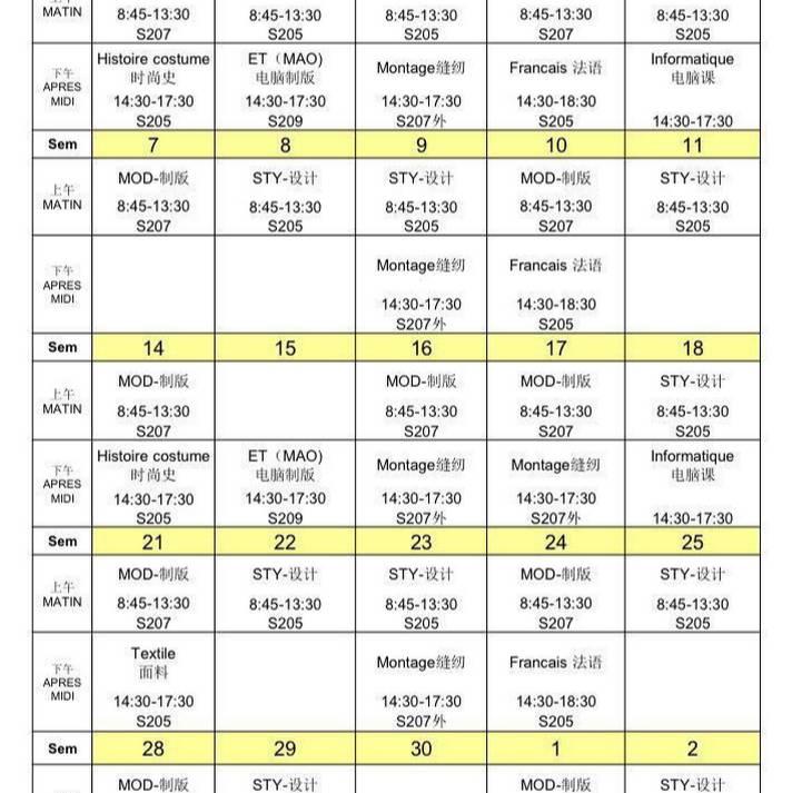 ESMOD广州的教学系统里重要的一环就是课表的设置。教学课程的设置是按月设定课表,从下图可以看出,我们的学生接受的制版与设计课份量较多。来到ESMOD广州的学生,能成功毕业也意味着:你已经成为了一名抗压、勤劳、高效且技艺踏实的人了。