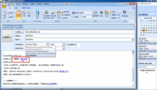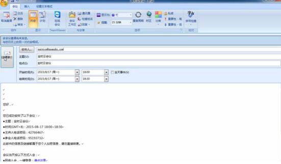 输入参会人邮箱地址,确认会议主题,并选择会议时间,点击发送,会议安排成功。主持人和参会人都将收到会议的日历提醒,如不使用outlook,也可通过其它邮件系统安排会议。