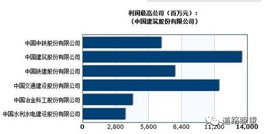 中国建筑135.37亿>中国交建116.01亿>中国铁建78.54亿>中国中铁66.90亿>中国中冶42.43亿>中国水电36.19亿