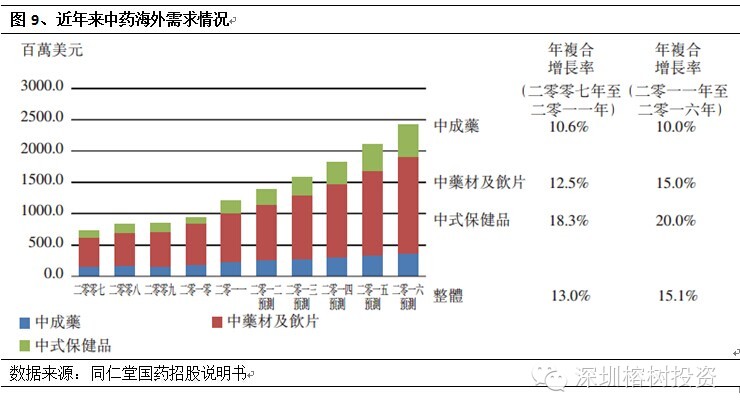 近年来中药产品在海外市场的需求量亦因其认受性提升而增加,中药产品的外销将在可见将来持续升势,估计至二零一六年将升至约2,425,500,000美元,由二零一一年起计年複合增长率约达15.1%。