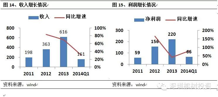 公司近年收入增长迅猛,营业收入由11年的1.97亿港元增长至13年的6.14亿港元,净利润由6000万港元增长至2.2亿港元,14年一季度收入和利润增速分别31%和79%。