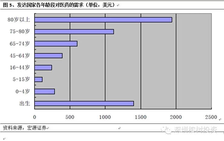 不同年龄的人群对药品的需求是不一样的。老龄人口疾病发病率高,且以重病,慢性病为主,老龄化比例的提高使得医药的需求也不断增加。国外的统计数字表明,免疫力相对较低的新生儿和老年人是对药品需求量比较大的两类人群,而青壮年的需求则相对较少,尤其是5-15 岁的青少年,对医药的消费量最低。