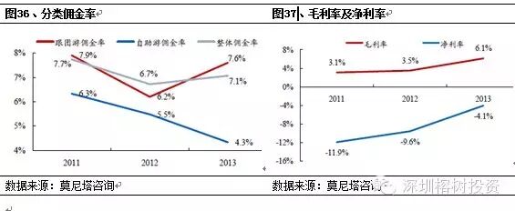 公司组团游类似批发业务,拥有产品定价权,以赚取买卖差价为主,近三年佣金率分别为7.9%、6.2%、7.6%。自助游采取代理商模式,佣金确认为收入,佣金率分别为7.7%、6.7%和7.1%。营业费用中,2013年研发费用率、销售费用率、管理费用率分别为2%、6%、4%,相比往年均呈下降趋势,净利润率分别为-11.9%、-9.6%和-4.1%。