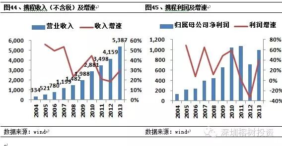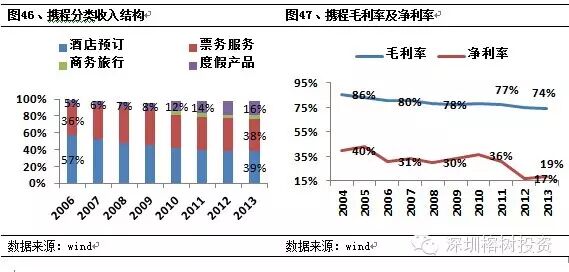 携程成立于1999年,2003年在美国纳斯达克上市,主要包括机票、酒店、旅游度假、差旅管理,已同全球超过43.4万家酒店建立了长期稳定的合作关系。从盈利模式来看,主要依靠机票和酒店的佣金收入等,酒店、机票以佣金方式计入,而旅游度假以毛利方式计入。携程2010-2012年期间受到艺龙等OTA价格战影响,增速放缓,但2013年随着CEO梁建章的强势回归,形势有所好转。2013年,公司总收入达57亿元(含税),增速上升至30%,净利润9.98亿,同比增长40%。公司综合毛利率74%,略有下滑,但净利率由17%回到19%。