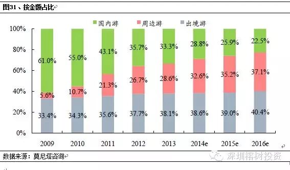 从旅游收入结构看,2013年出境游是第一大板块:1)出境游游客购买能力强,对在线预订出境游产品的方式接受度高;2)出境游产品客单价高。国内游是第二大板块,约占整体的33.3%。周边游虽然目前占比最低,但凭借其消费单价低人群规模大且消费频次高的特点,来发展速度较快,未来占比有望显著提升。