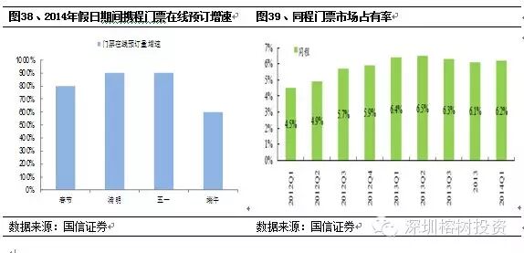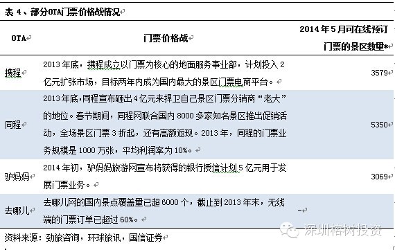 同程以“休闲旅游第一名”为战略目标,在景点门票预订市场处于绝对领先地位。2013年服务人次达到2000万,年均增长100%。2014年同程发布自主研发的智慧票房:这是一套景区门票终端售、取票系统,可缓解游客在线订票后现场取票长时间排队的问题,并节约景区运营成本。目前,智慧票房系统签约景区已经超过2000家。从旅游度假行业来看,不管是最上游的目的地资源供应商市场(包括地接、门票、机票/酒店、餐饮等),还是主要提供旅游产品的打包批发旅行社市场,特性就是供应商众多,行业集中度低。这就导致OTA需要花费大量的时间和耐心去挨个跟目的地资源供应商(同程等)或旅行社批发商(途牛等)谈判签约以获取上游资源,直接导致了这个细分子行业的在线渗透率低。目前来看,各大OTA主要通过价格战获取在线门票市场,13年年底携程宣布进入门票市场,计划投入2亿元扩张市场,“只求销量第一不求赚钱”,掀起与门票预订领域领先者同程网等公司的价格战,部分门票返现力度甚至一度接近100%,但随着携程4月末战略入股同程,驴妈妈缺少强大的资金支持,价格战可能将逐步退出,未来会进入提高行业在线渗透率过程。