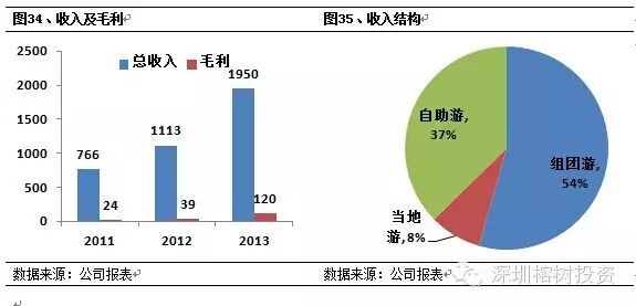 公司近三年收入分别为7.6亿、11.1亿和19.5亿,年复合增长59.6%,近三年毛利率分别为3%、3%和6%,净亏损分别为0.92亿、1.07亿和0.79亿。2013年,出境游产品约占其总交易量的70%,组团游和自助游占总交易额比例分别为54%和37%,当地游占8%。