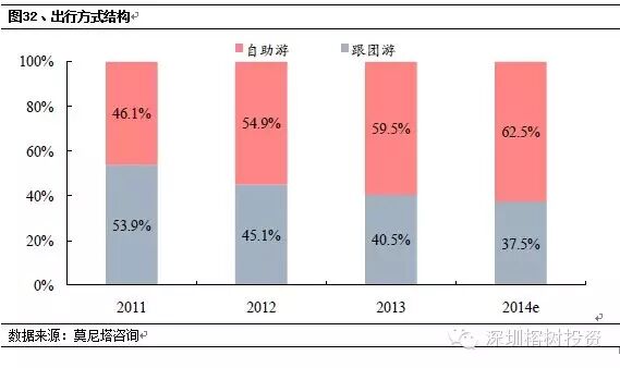 按出行方式分,目前跟团游占比40.5%,自助游占比59.5%。自助游是在线旅游度假市场的新方向,未来占比有可能进一步提升。跟团游作为“入门级”旅游产品,在部分细分游客群体(如中老年、首次旅游者、首次出境旅游者等)、部分旅游目的地(如出境旅游)仍具有很强的不可替代性。