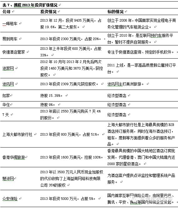 近三年携程酒店预订业务的收入分别为15亿、17亿、22亿。携程酒店以代理为主,分“保证配发”和“即时请求”两种。在“保证配发”模式下,酒店保证每天指定数量的可用客房,以便携程先向客户确认预订,再通知酒店。2013年,公司在中国的7万间酒店大部分都保证配发,让公司即使在旺季也能为客户及时提供确认签约。其余酒店供应商在“即时请求”模式下,视预定时的情况为客户提供房间。另外,携程和酒店签订协议,某些月份如果卖出了超过约定数目的间夜,佣金比例就会提升,公司平均佣金比例在14%-15%左右。根据劲旅咨询,2013年中国在线酒店市场交易额约为614.6亿元,其中携程占28.7%,经济型酒店官网占28.6%,艺龙占14.1%。公司通过不断的投资,加深与酒店的合作关系,目前拥有汉庭9%的股份,7天4%的股份,如家15.39%的股份,快捷酒店管家33%的股份,上海大都市旅行社51%的股份。还持有香港星程酒店和香港华闽旅游。上海大都市旅行社是B2B酒店预订服务商,同时在海外酒店预订、租车、度假等方面提供着众多的服务和产品。华闽旅游是中国地区酒店订房批发商,直接代理香港、澳门和中国内地近2000家的星级酒店。
