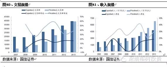 从交易规模上看,尽管Expedia总交易规模更大,但近年来增速不及Priceline,2013年二者交易规模已经十分接近。预计2014年,Priceline交易额有望超越Expedia。从收入看,自2005年Priceline收购Booking后一直保持较快增长,2010年Priceline总收入首次超过Expedia,随后收入差距逐年增大。2013年Priceline总收入为67.93亿美元,同比增长29%;Expedia总收入为47.71亿美元,同比增长18%。