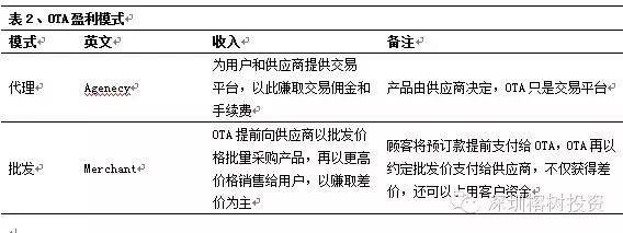 OTA主要有代理(佣金/Agency模式)模式和批发模式(Merchant 模式)两种模式,代理佣金模式更多的应用在机票领域,批发模式在酒店领域和度假领域相对更多。
