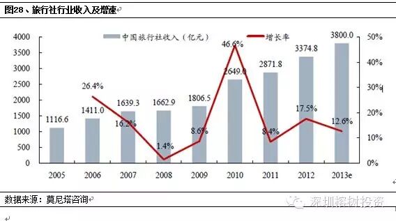国家旅游局数据显示,2012年我国有将近2.5万家旅行社,同比增长5.3%,中国旅行社行业营业收入达3374.8亿元,较往年增长17.5%。艾瑞咨询预计,2013年中国旅行社营业收入将达到3800亿元,增速保持在10%以上。
