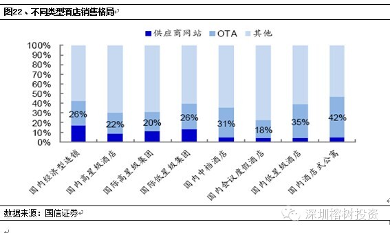酒店供应商品类繁多,上游较分散,与航空公司多数寡头垄断的格局有所差异,在线上销售中对OTA的依赖也更强,因此OTA在酒店分销渠道中议价能力仍相对较强,收益率也高于机票产品。根劲旅咨询统计,按交易规模计算,2013年我国在线酒店市场OTA分销占比在50%左右,按间夜量计,OTA分销比例在60%-70%之间,略高于美国市场OTA的分销占比。当然,不同酒店类型对OTA渠道的依赖程度各不相同,越是品牌知名度高,会员体系包括协议价格体系完备的连锁酒店,对OTA的依赖越低;越是品牌知名度低或者单体酒店,对OTA的依赖程度就越高。2013年,国内各类型酒店中会议度假型酒店和国内外高星级酒店对OTA的依赖相对最低,其次为国内经济型酒店和国际品牌的低星级酒店,国内低星级酒店和国内酒店式公寓对OTA的渠道依赖相对最高。