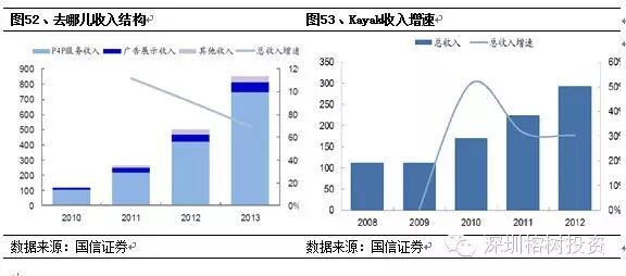 去哪儿网2005年创立于北京,2013年在美国纳斯达克上市,主要致力于为旅行者提供国内外机票、酒店、度假、旅游团购等旅行信息的搜索。2011年6月百度成为去哪儿网第一大机构股东。去哪儿的盈利主要包括点击型收入(一般要求供应商预付)、展示型广告收入等。2013年去哪儿实现总收入8.51亿元,同比增长70%。Kayak是美国在线旅游搜索平台,2004年由Expedia、Travelocity和Orbitz共同创立,提供机票、酒店、租车和度假产品的搜索服务,营业收入主要也是来自点击付费收入(按点击量或销售额计算收入)和广告收入(按CPC和CPM计算,包括OTA企业、第三方赞助商和各旅游产品供应商)。2012年Kayak总收入2.93亿美元,同比增长30%。