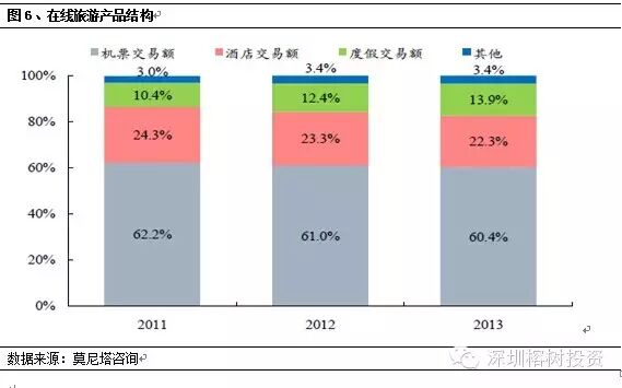 从在线旅游产品销售结构上看,主要由机票、酒店及度假等构成。机票业务近年来尽管占比有所下滑,但仍占60.4%,酒店预订占22.3%,度假占比继续上升至13.9%。