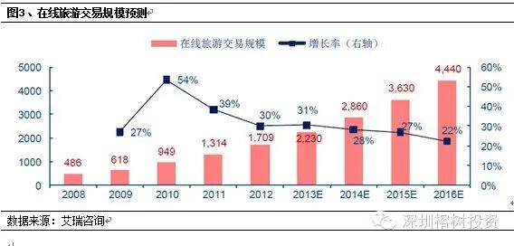 据艾瑞网2012年预测,未来旅游行业增长仍将保持10%左右的增长,到2016年将达到3.7万亿的水平,在线旅游渗透率逐步提升至12%,在线旅游行业规模可达到4400亿左右。