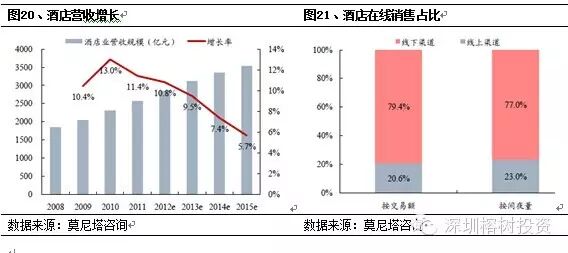酒店产品线上化比例明显低于机票产品,据劲旅咨询统计,按交易额计算2013年我国酒店预订线上渗透率达20%,距离欧美的30%(品牌连锁酒店超过50%)仍有一定差距。近年来,酒店行业增速不高,预期几年也是个位数增长,但随着渗透率的提升以及OTA在酒店线上的主导地位,预期未来仍将获得一个比较不错的增长。