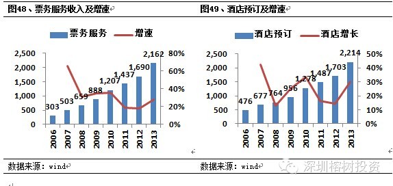 携程票务服务收入主要指机票预订,火车票预订及其他相关服务。其他服务包括销售航空和火车保险、送票服务、网上办理登机和其他增值服务(比如网上选择座位和航班动态)。近三年携程票务服务的收入分别为14.4亿、16.9亿、21.6亿。2013年出票量同比增长33%(其中包括了火车票、汽车票的增长),收入增长28%。2013年国内民航总出票规模增长率为9%,在线旅游网站的出票量增长率远高于民航总出票规模的增长率,携程网在其中更是一枝独秀。