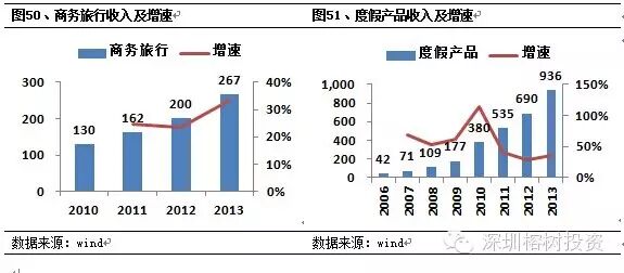 2013年,公司度假产品收入和商务旅行的收入分别为9.4亿和2.7亿,分别增长36%和34%,明显高于其他业务。公司在线度假市场占有率达到21%,位居同行首位。此外公司还在休闲旅游业务上积极布局,主要包括收购相关公司、通过价格战提升门票业务份额、提前布局汽车租赁市场。